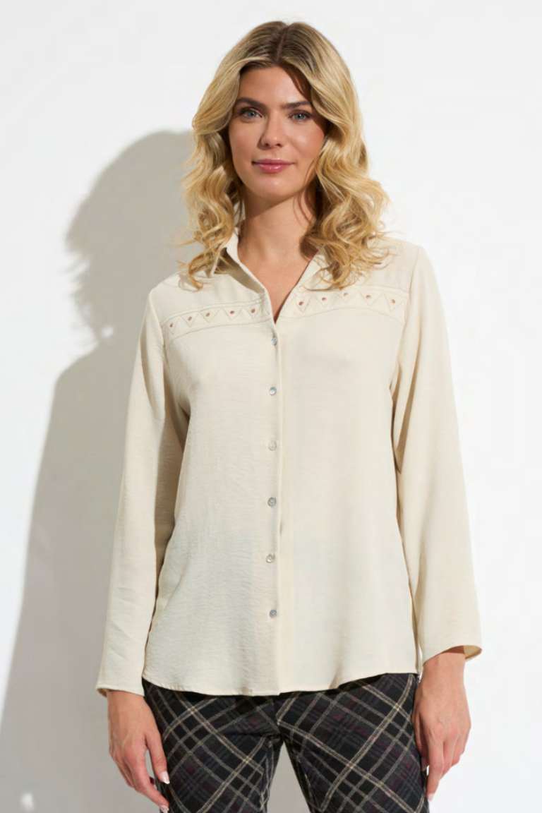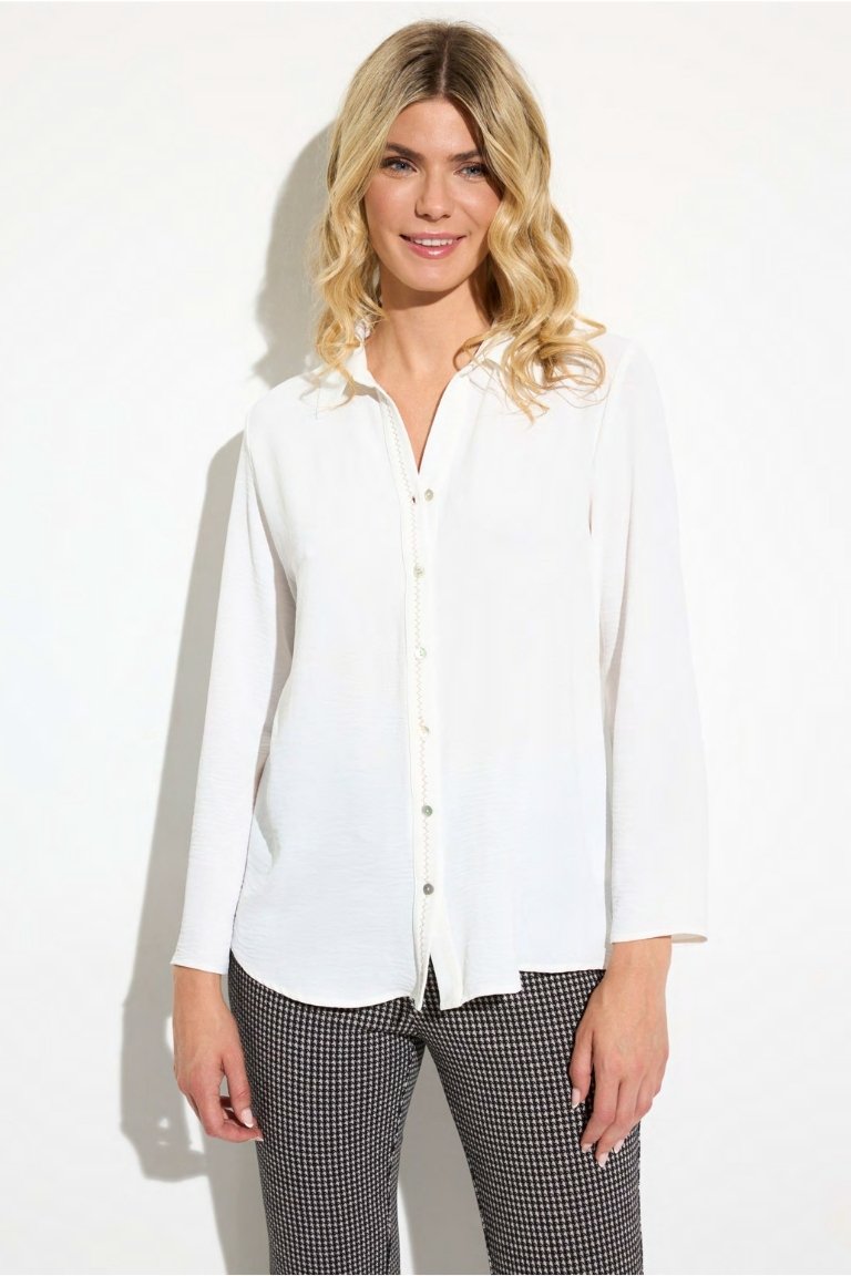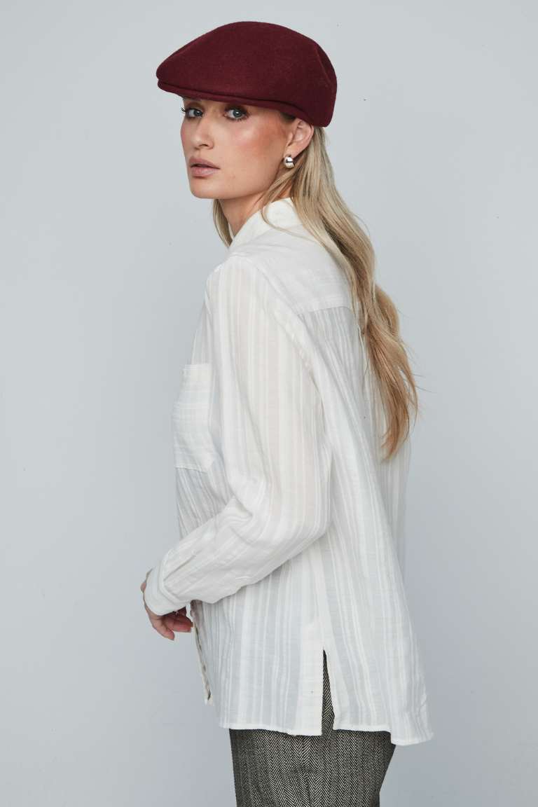 Un básico sofisticado que no puede faltar en tu armario. Esta camisa blanca de manga larga está confeccionada en un tejido ligero con delicadas rayas texturizadas que aportan un toque de estilo y distinción. De corte recto y cómodo, cuenta con cuello clásico, bolsillo frontal y cierre con botones, lo que la convierte en una prenda versátil para looks tanto casuales como elegantes