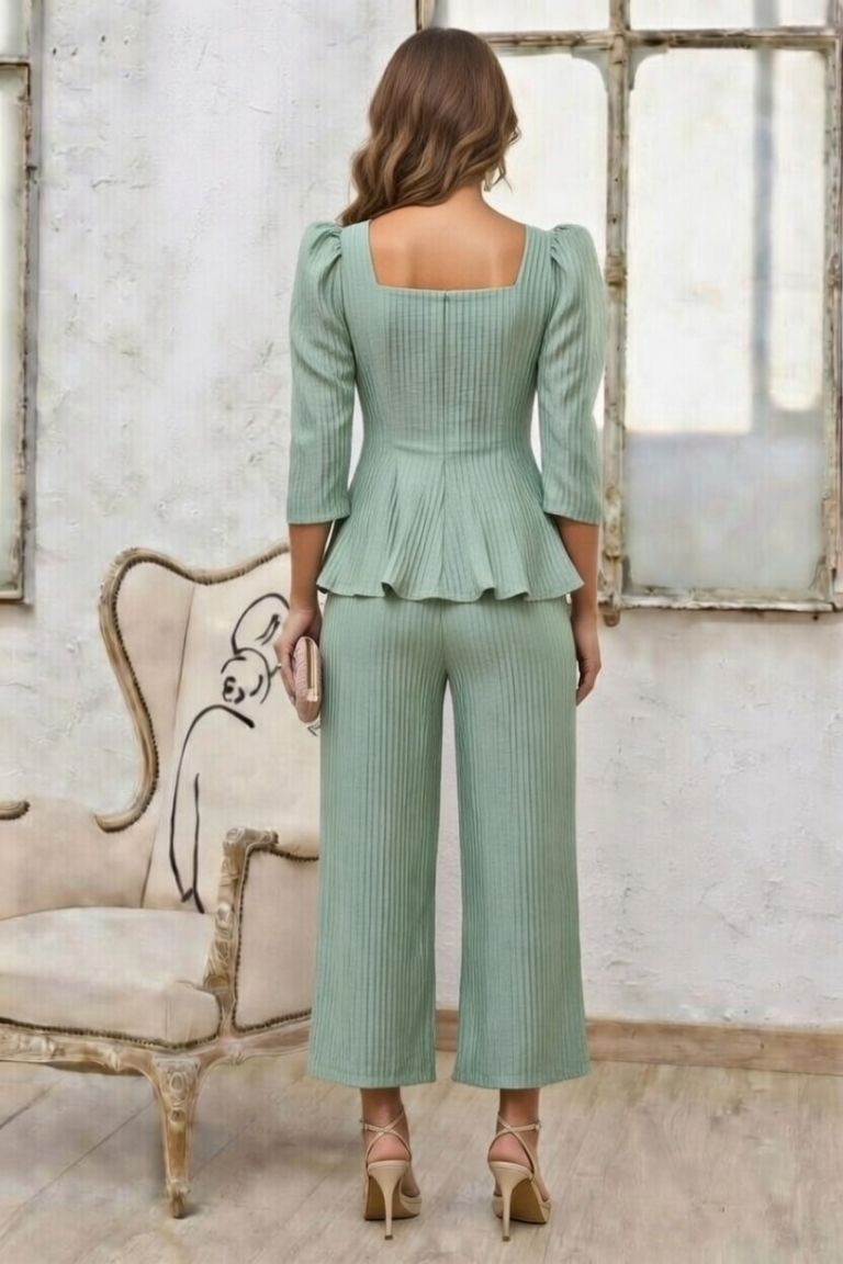 Este conjunto en tono verde agua destaca por su estilo delicado y contemporáneo, ideal para eventos de día o celebraciones especiales. Confeccionado en un tejido ligero con textura plisada, ofrece una caída fluida y un tacto suave que aporta comodidad y sofisticación. El top de escote cuadrado realza el cuello y el escote de forma sutil, mientras que las mangas tres cuartos con ligero volumen en los hombros añaden un toque femenino y actual. Su corte evasé aporta movimiento y favorece la silueta. El pantalón largo de pierna ancha completa el conjunto con una línea elegante y estilizada, perfecta para alargar visualmente la figura.