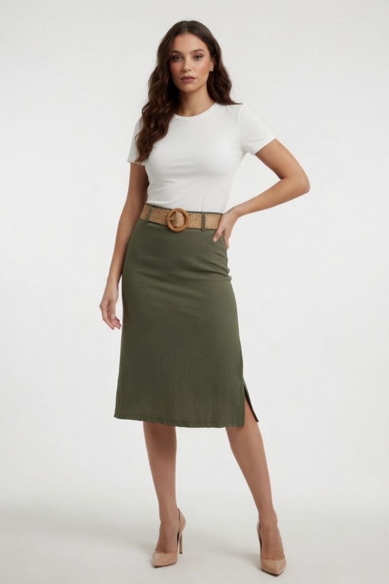 Versátil y favorecedora, esta falda de corte recto es una prenda imprescindible para el día a día. Su largo por debajo de la rodilla aporta un estilo equilibrado entre comodidad y elegancia, ideal para múltiples ocasiones.