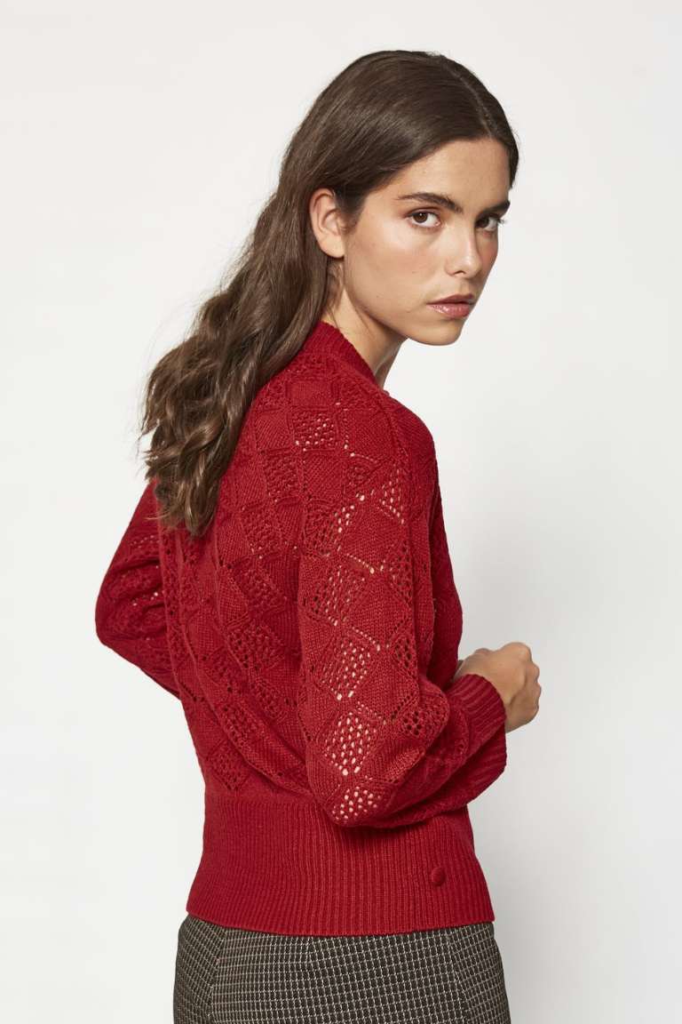Añade un toque elegante y versátil a tu armario con este jersey de punto calado en color rojo intenso. Su diseño con motivos geométricos y transparencias sutiles lo convierte en una prenda femenina y sofisticada, ideal para combinar tanto con vaqueros como con faldas o pantalones de vestir. Perfecto para lucir en entretiempo o para superponer sobre camisas y tops, este jersey será un imprescindible de tu colección de básicos con estilo.