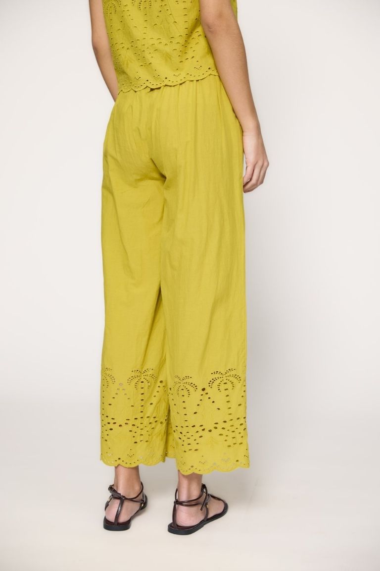 Eleva tu estilo con este pantalón fluido en un llamativo tono mostaza, perfecto para los días de calor. Su diseño de pierna ancha aporta movimiento y comodidad, mientras que el delicado detalle calado en el bajo añade un toque distintivo y femenino. Confeccionado en un tejido ligero y de caída suave, este pantalón es ideal para crear looks frescos y sofisticados. Combínalo con el chaleco a juego para un conjunto coordinado lleno de estilo, o llévalo con prendas básicas para un outfit más relajado.
