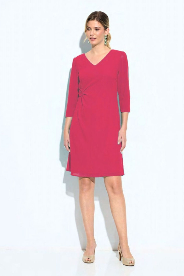 Este vestido corto es una apuesta segura para un look elegante y versátil. Su diseño limpio se realza con un delicado nudo lateral a la altura de la cintura, que estiliza la silueta y aporta un toque femenino y original. Presenta escote en pico, manga tres cuartos y una caída fluida que lo convierte en una prenda cómoda y muy favorecedora, ideal tanto para eventos como para ocasiones especiales de día o de tarde.