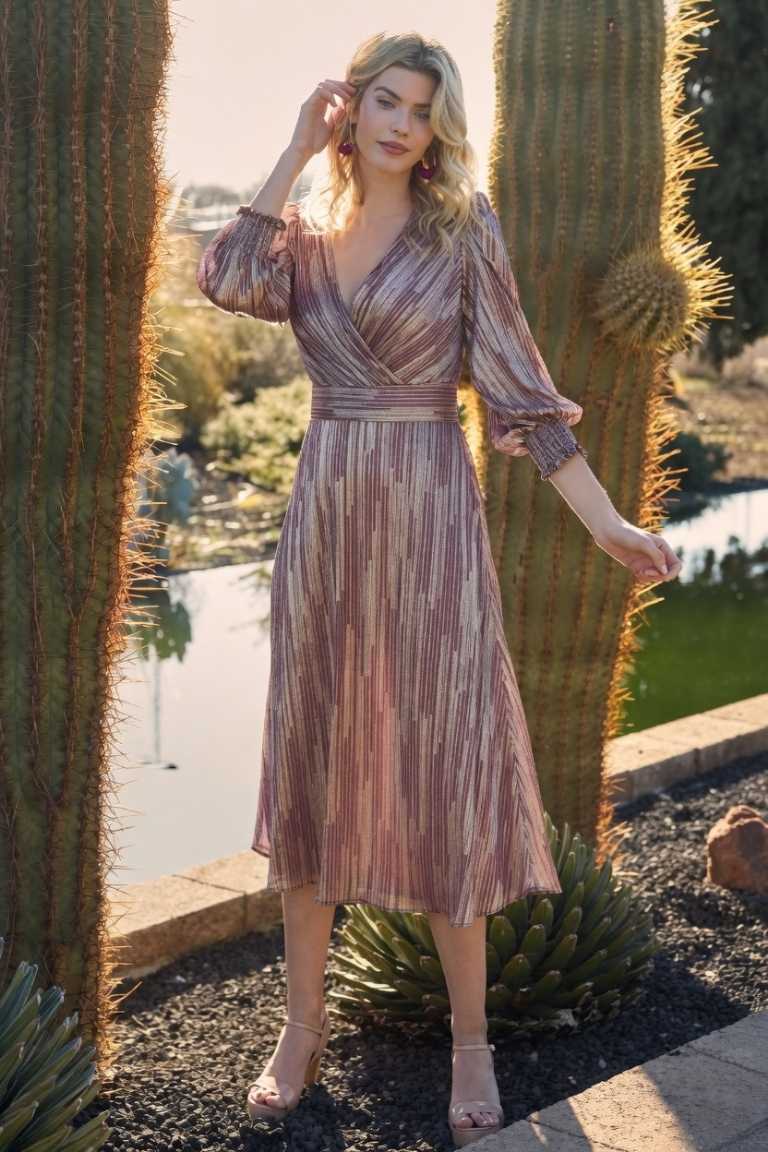 Destaca en cualquier ocasión con este vestido midi de corte fluido y elegante. Su diseño cruzado en el escote realza el pecho de manera favorecedora, mientras que la cintura entallada estiliza la silueta. Las mangas largas con puño elástico aportan un toque romántico y femenino. El tejido ligero plisado con acabado metalizado y efecto de rayas multicolor hace que este vestido brille con cada movimiento, convirtiéndolo en la elección perfecta tanto para eventos de día como de noche.